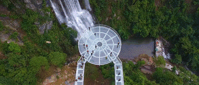 懸空玻璃平臺全長202米,以72米的懸空跨度名列世界第一,為美國科羅拉多大峽谷的U形橋(21米)的3.5倍;點(diǎn)睛之筆是平臺頂部直徑16.8米的玻璃觀景圓臺,這是和瀑布親密接觸的絕佳位置。圓臺中間獨(dú)具匠心地設(shè)計了網(wǎng)格狀鏤空,山風(fēng)穿透,頓生寒意;踏步其上,如墜深淵,令人心驚膽寒。